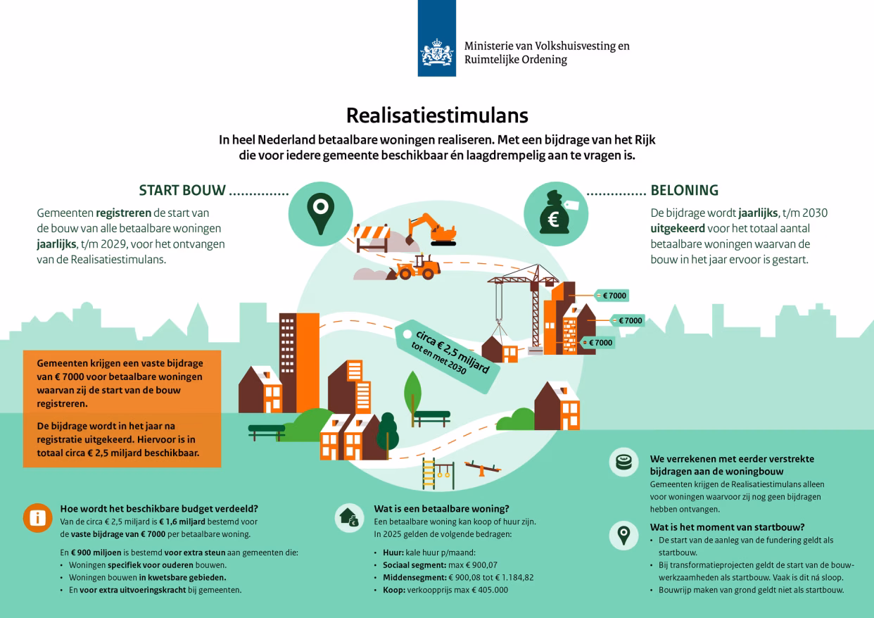 - Realisatie stimulans — een regeling van de overheid van € 2,5 miljard die gemeenten financieel ondersteunt bij de realisatie van betaalbare woningen. Zie Volkshuisvesting Nederland of de Rijksoverheid.
